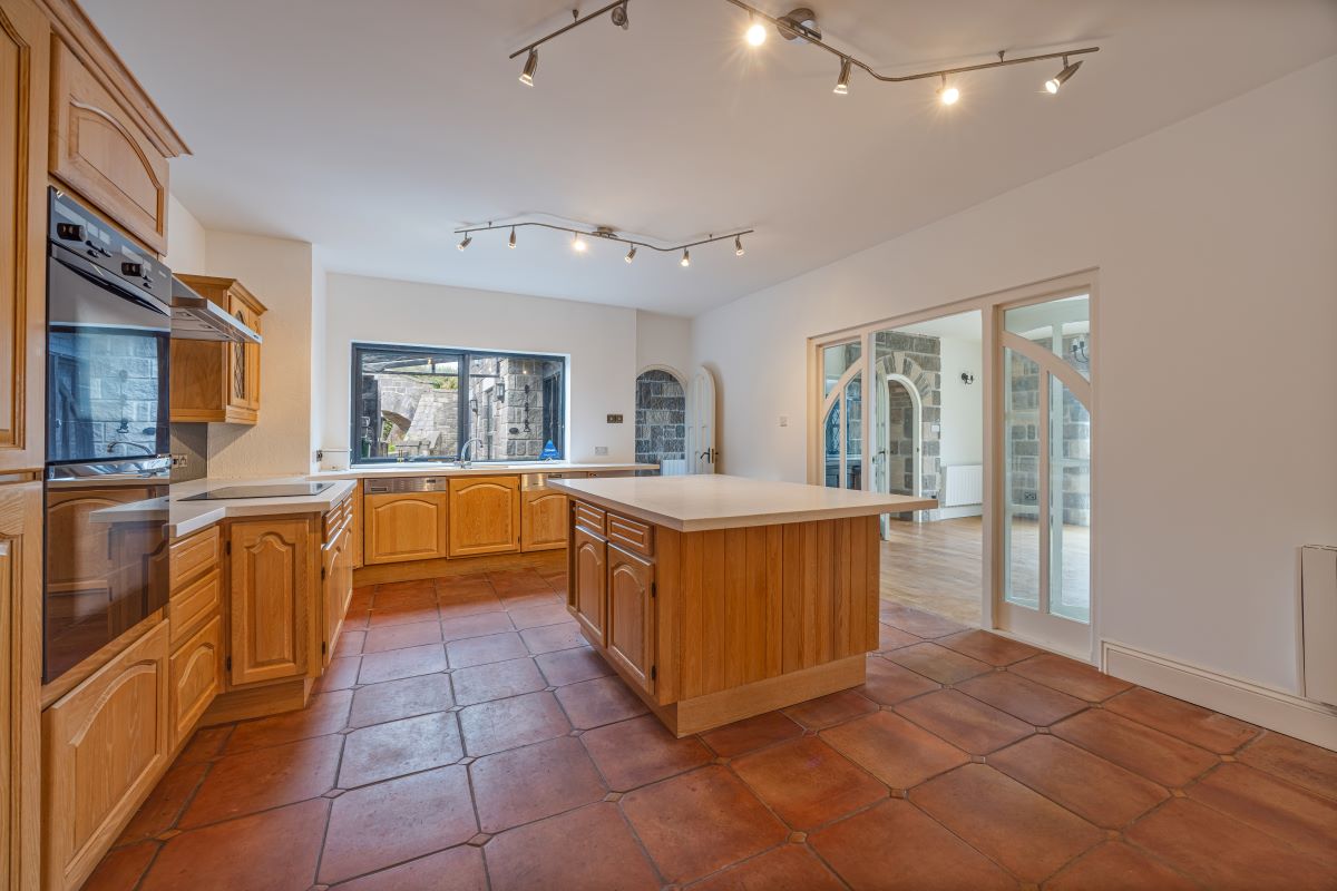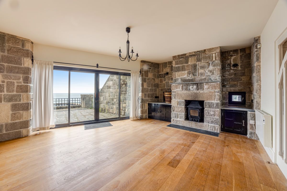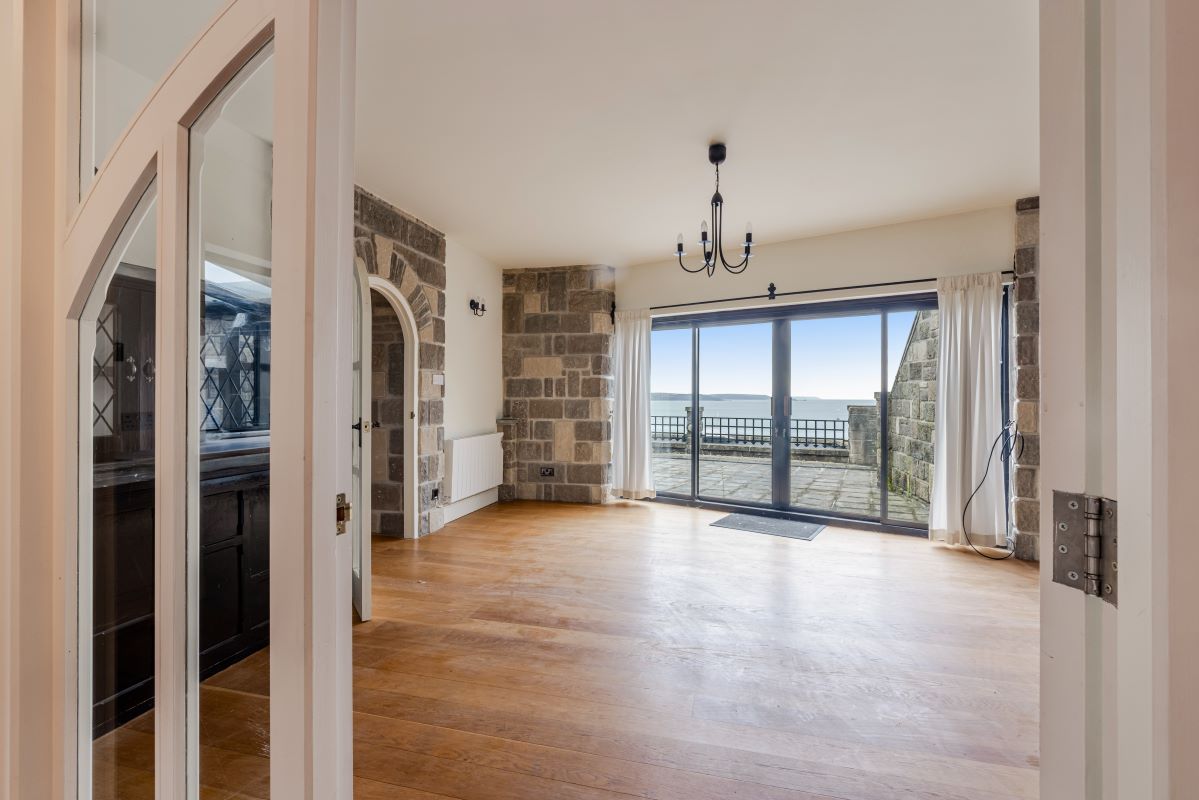 The apartment extends to approximately 1,754 sq ft and offers generous proportions throughout. A welcoming entrance hall opens into a spacious kitchen/breakfast room with fitted units, integrated appliances and ample space for informal dining. The dining room, complete with feature fireplace and wood-burning stove, connects directly to the terrace, while the sitting room provides a second reception with equally impressive views and access to the outdoor space.
