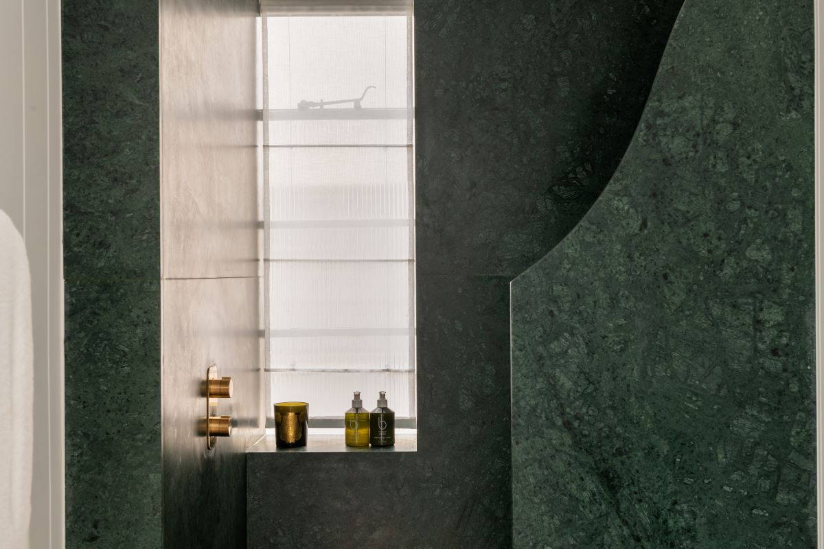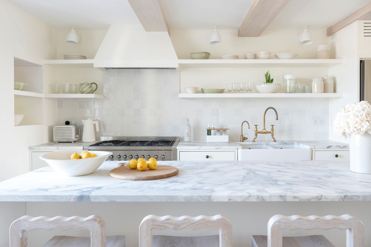 • Air conditioning, wide-plank oak floors, bespoke kitchen with Arabescato marble and gas range