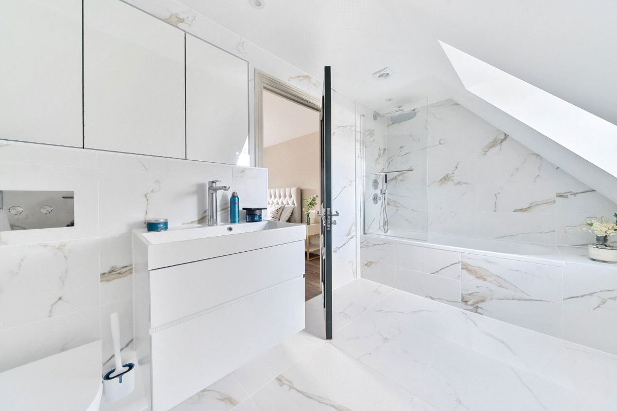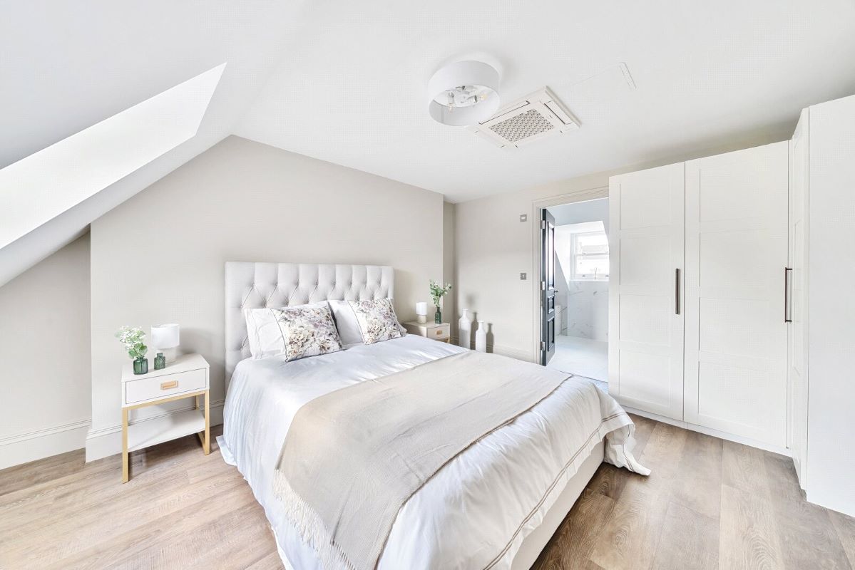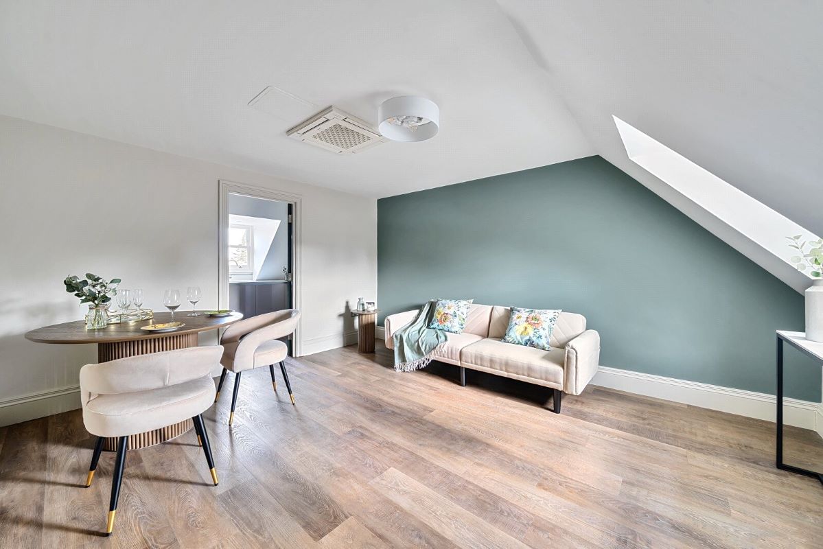 Flat 3, Devoncroft House is a well-designed one-bedroom apartment situated on the top floor of a newly refurbished residential development in the centre of Esher. The property offers modern open-plan living, sleek interior design and is offered with vacant possession, making it ideal for first-time buyers, downsizers, or investors. The apartment spans approximately 51.3 sq m (554 sq ft) (including 86 sq ft of Limited Use Area under eaves) and includes a bright reception / Kitchen room with Amtico flooring, air conditioning and underfloor heating. The open-plan kitchen is equipped with quartz worktops and Bosch appliances, while the bathroom has been fitted with Grohe fixtures in a contemporary finish. The bedroom is a spacious double, with clean neutral décor and fitted storage. The apartment is accessed via a communal entrance and includes one allocated parking space to the rear.