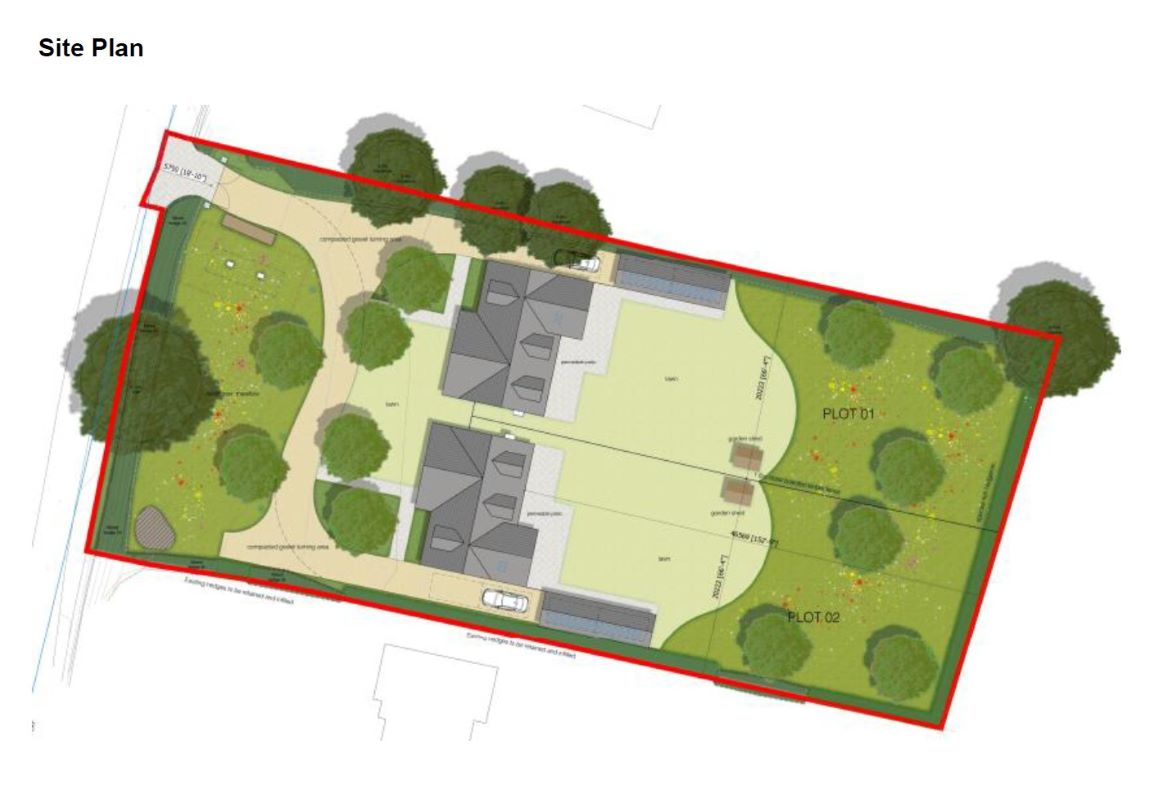 0.88 Acres of freehold land with planning permission for two x 3 bedroom houses. Each plot including garage has a GIA of 262m2