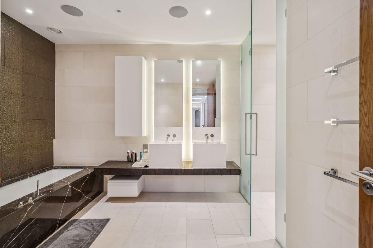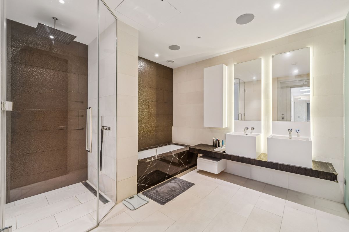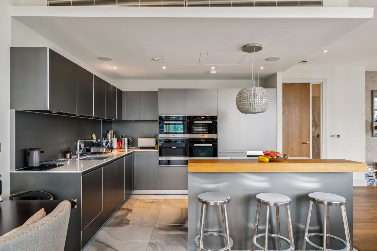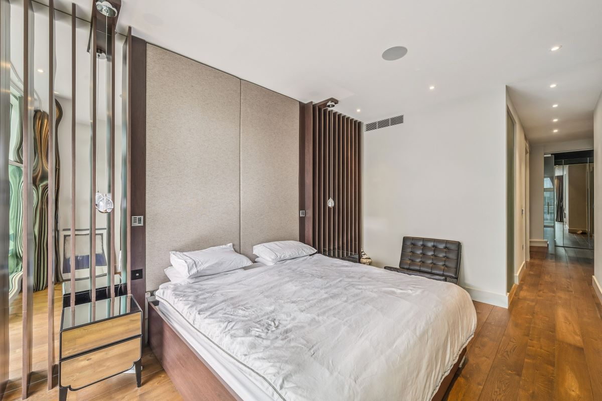 Designed for modern living, the apartment features high ceilings, floor-to-ceiling glazing, and a vast open-plan reception and kitchen area — ideal for both everyday living and entertaining. The bespoke Bulthaup kitchen is fitted with Miele appliances, combining minimalist German design with exceptional performance. The generous layout ensures abundant natural light and a seamless flow, with all principal rooms benefitting from the impressive scale and views.