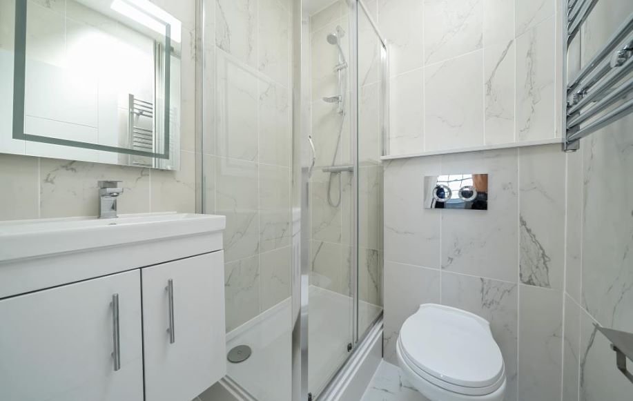 The accommodation comprises an entrance lobby leading to a spacious reception room with herringbone flooring, a modern fitted kitchen with integrated appliances, a double bedroom, and a stylish shower room finished in marble-effect tiling.